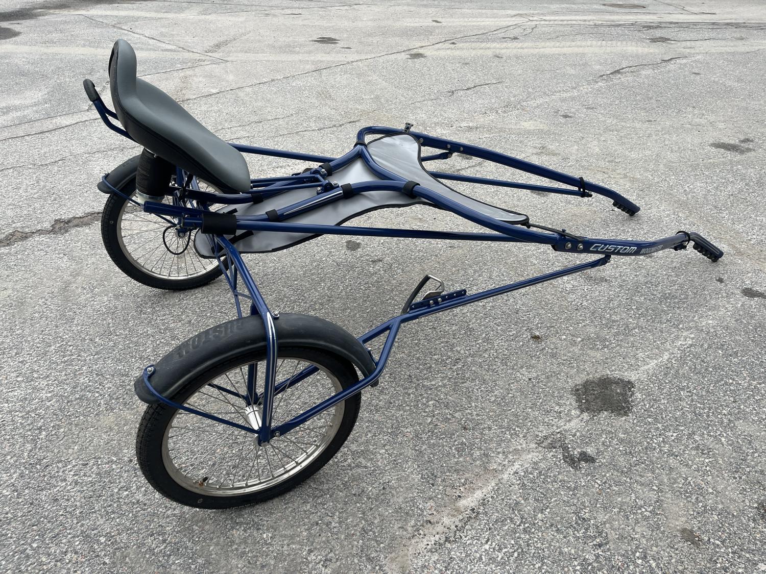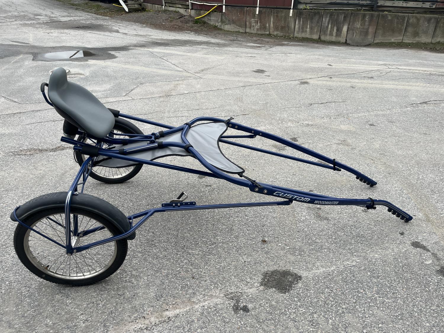 This jogcart is repainted in dark blue with silver stripes. New seat, new wheels, new mudguard and new QH fittings. This jogcart is as good as new.