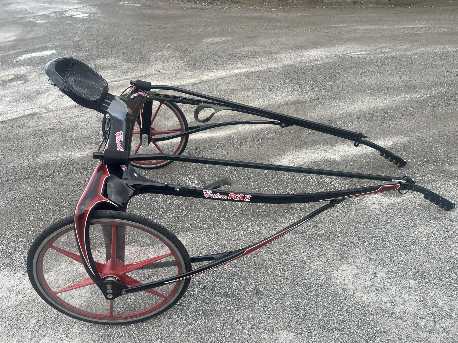 Begagnad nymålad Custom FCS II. Svart röd/vit, 132 bred 198 skalmar. Nymålad, helrenoverade kolfiberhjul, ny sits och stänkskärmar. Vagnen är som ny.